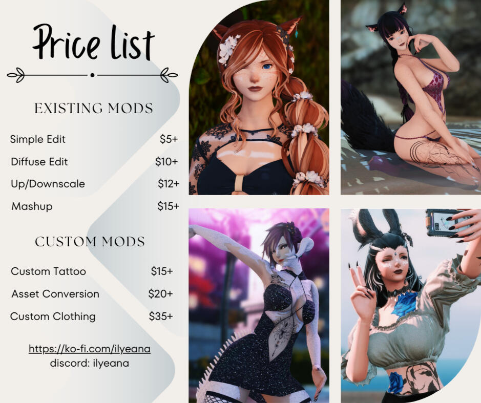 Hello, I'm Ilyeana! Gaming & Art are two of my passions, and through FFXIV I am able to combine them.I started to learn 3d modelling basics a few years ago along with some easy coding, and have produced modpacks and art assets for other games along the way. Since diving into the moonlight that illuminates Eorzea I have refined my skills with programs like Blender, GIMP, Substance Painter, Substance Designer, and Marvelous Designer.What kind of magic can we make together?